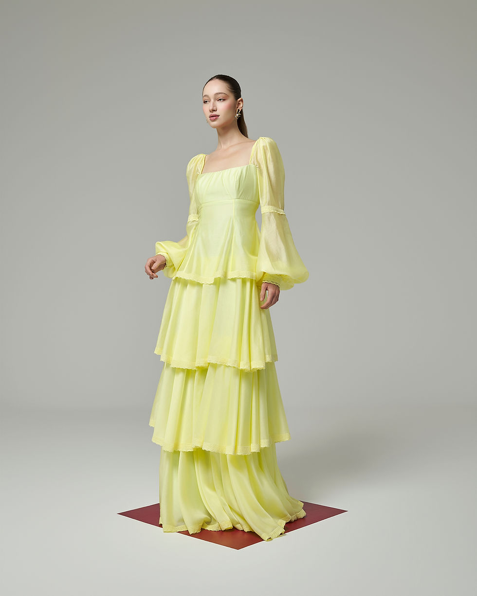 A cintura com elástico embutido define delicadamente a silhueta, enquanto a saia em camadas assimétricas garante leveza e efeito esvoaçante. O forro leve proporciona conforto e transparência controlada, mantendo a sofisticação do tecido.